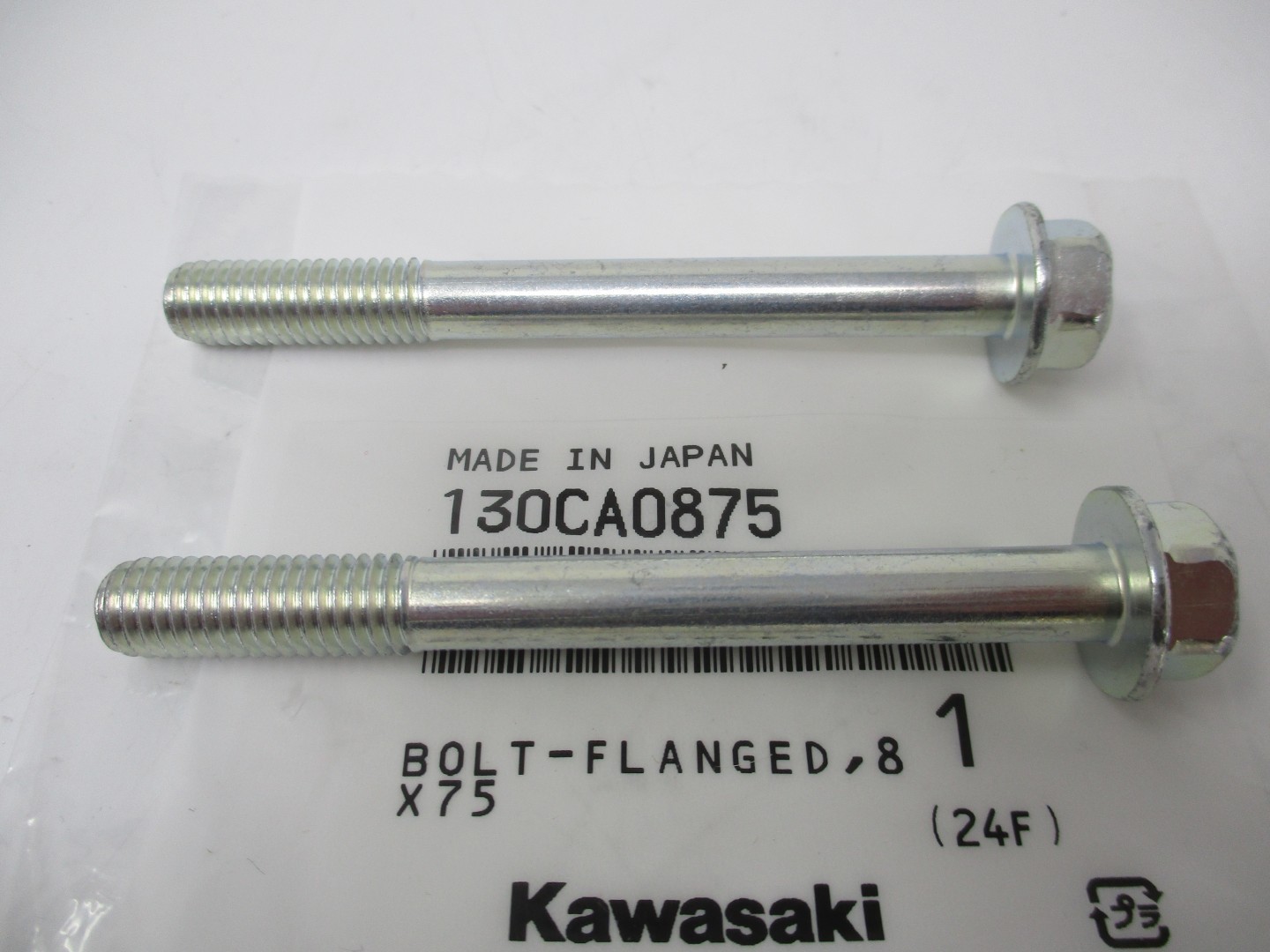 A: Each bolt is a genuine Kawasaki 130CA0875 flanged head bolt measuring 8mm in diameter and 75mm in length. The flanged head eliminates the need for a separate washer.