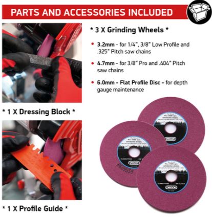 Includes: Grinder, a dressing brick and profile guide, operator instructions plus two grinding wheels (3.2mm & 4.7mm) and a 6.0mm flat profile disc for depth gauge maintenance